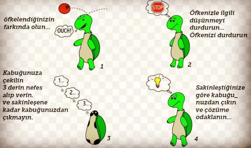 Sakinleşme tekniklerini öğretin: "3 + 10" tekniği çocukların sakinleşmesi için son derece etkili bir yöntemdir. Bunun için önce öfke öncesi bedenimizin verdiği sinyalleri çocuğa anlatın. Yüz ifademizin değişmesi, yumruk sıkmak, burundan hızlı hızlı nefes almak gibi davranışların öfke öncesi sinyaller olduğunu ve bunları hissedince 3+10 tekniğini uygulamamız gerektiğini uygulayarak gösterin. 3 derin nefes alıp vermek ilk aşamadır. 3 kez olabildiğince yavaş ve uzun nefes alıp, olabildiğince yavaş ve uzun verin. Yürüyen bir merdivenin ya da asansörün inip çıkmasını örnek vererek anlatmak onların daha kolay anlatmasını sağlayacaktır. Bunu yaptıktan sonra yavaşça 1'den 10'a kadar yavaşça sayması gerektiğini öğretin. Bu uygulamayı yazarak ya da çizerek evin birkaç yerine asın. Uygulamayı öğrenen çocuğun kendini kolayca sakinleştirebildiğini göreceksiniz.